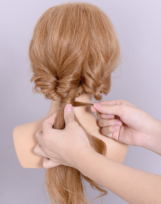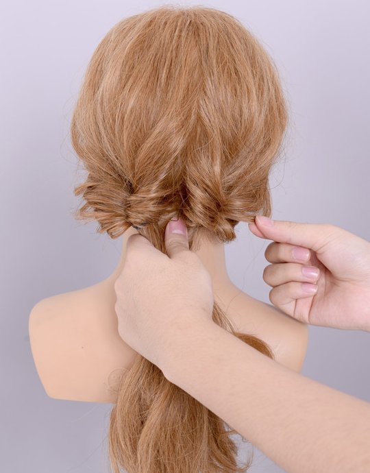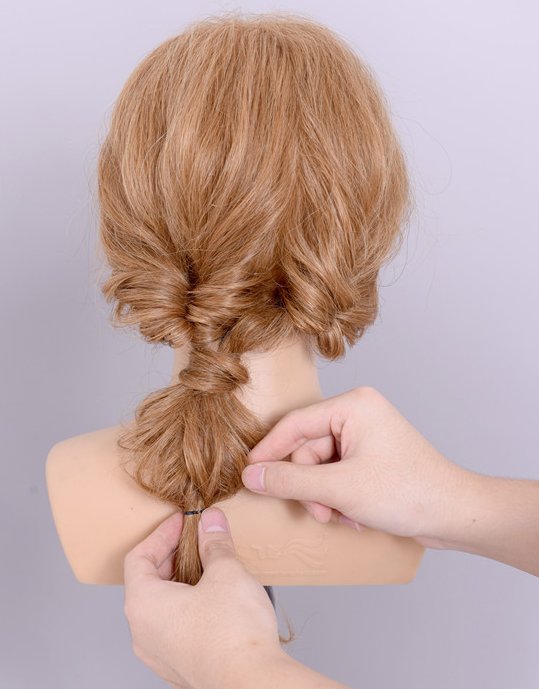 步骤六:取发尾头发将两份马尾缠绕在一起。