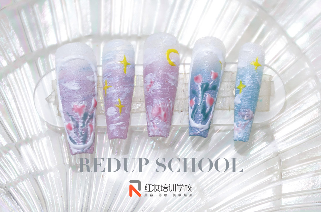 郁金香的魅力端庄可是出了名的,是很多女性朋友们都非常喜欢的一种花,不仅外表艳丽高贵,还具有很好的寓意。很多年轻女孩子都喜欢做郁金香美甲,好看又高贵。今天海口红妆学校美甲培训班学员也制作了一款郁金香美甲,打造的是油画风格,高雅且神秘的感觉。一起来看看吧。