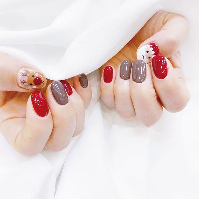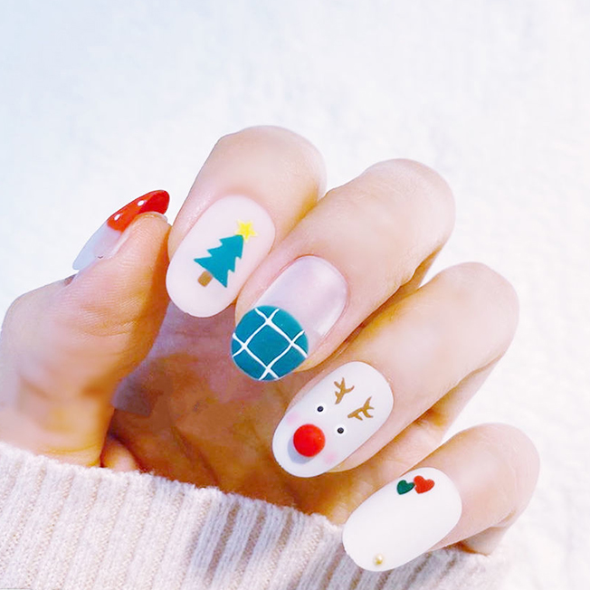 琳琳同学的这款作品整体简约、大方,加入圣诞树和麋鹿的元素,圣诞节气氛就出来了,喜欢简约款美甲可以试试这一款。
