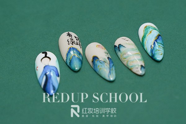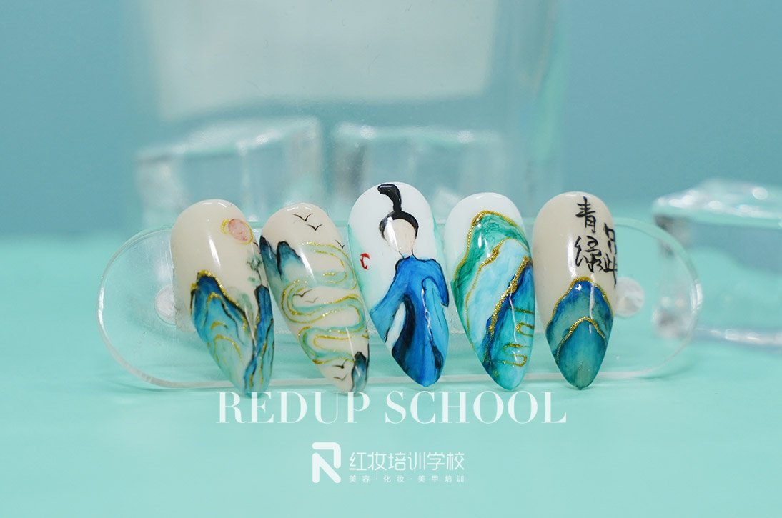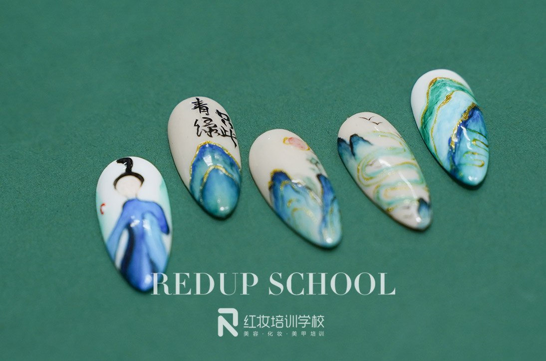 春晚舞蹈诗剧《只此青绿》惊艳出圈,舞者以绚烂之身,勾勒出诗如幻的无垠山河,将中国古典式传奇娓娓道来。海口红妆学校特别企划安排上了——手绘青绿美甲,山河绵延,青绿晕染,用素雅高级的色彩,勾勒指尖的千里江山。下面我们一起来欣赏下手绘青绿美甲作品吧。