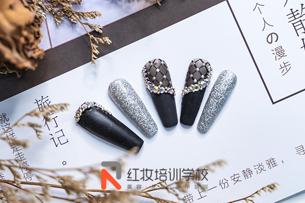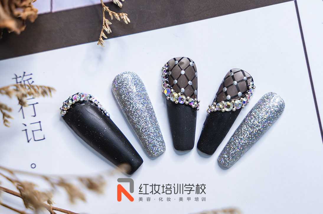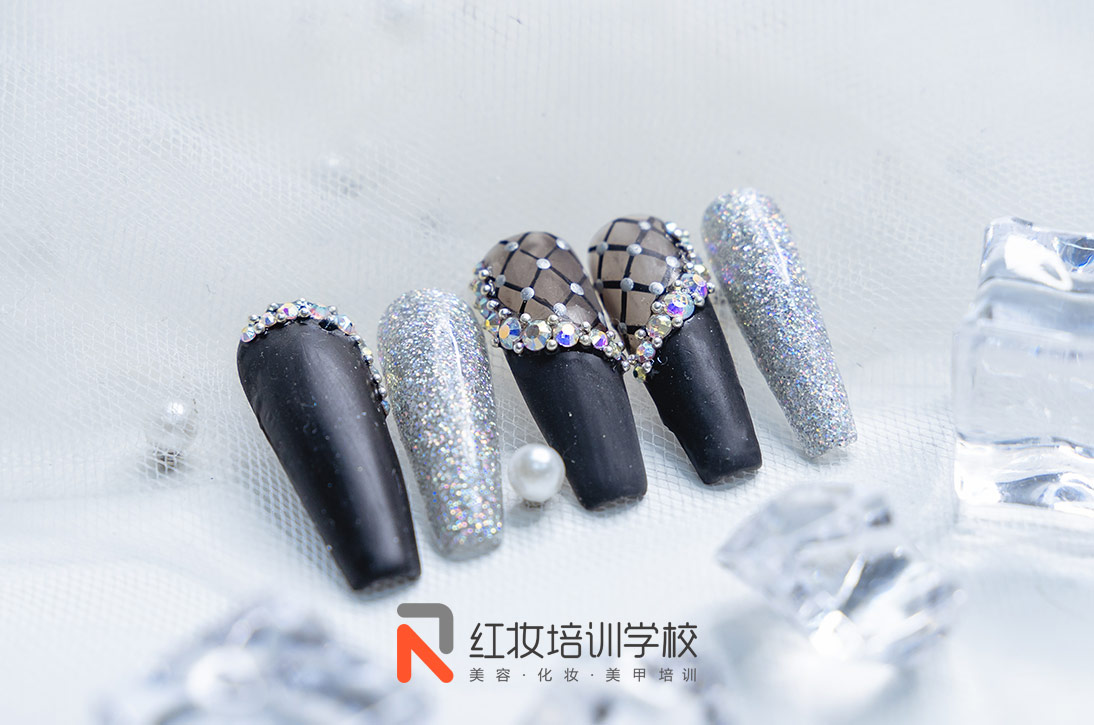 红妆学校美甲培训班出的这款暗夜星空美甲,碎钻修饰浅黑网格,搭配银色细闪亮片,满分精巧的搭配,让高级感溢出屏幕,酷girl和时髦精们必备美甲,上手显白又非常有气质,又美又飒还看到尖叫啊!