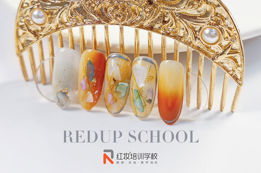 夏天朝阳似火,热情奔放,美甲款式也跟着变换绚丽缤纷的色彩,今天带大家来欣赏一组海口红妆美甲培训学校美甲培训班学员考核作品——鎏金琥珀美甲,这个色彩搭配非常适合这个浪漫的夏天哦,一起来看看这组美甲的特色吧!