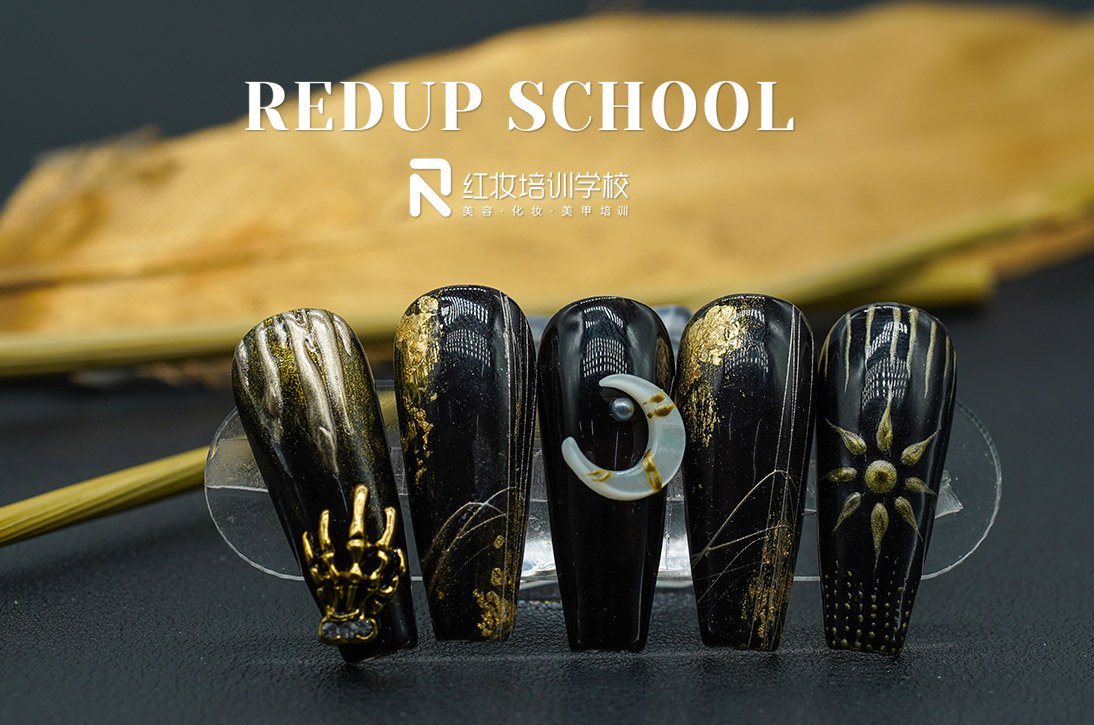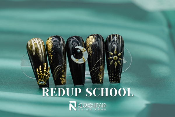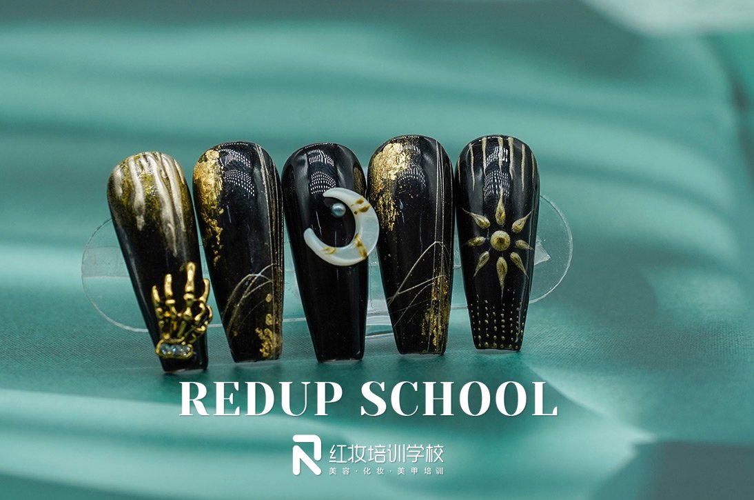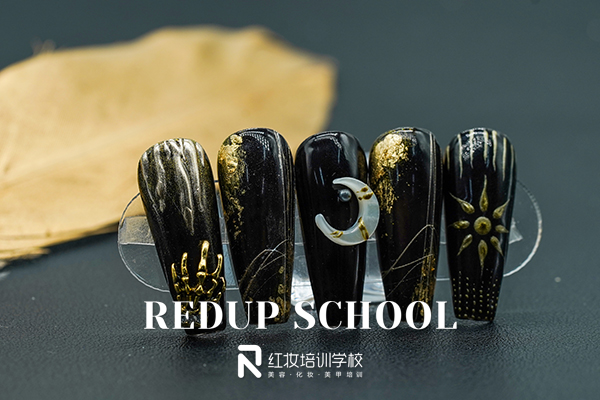 海口红妆学校东方青苍美甲,融入尊上黑金华服元素,骨兰和浅浅勾勒的兰花,时尚优雅尊上即刻出道。