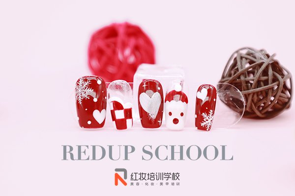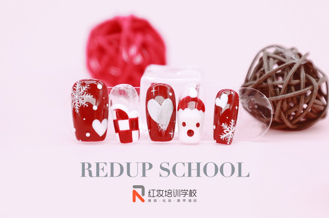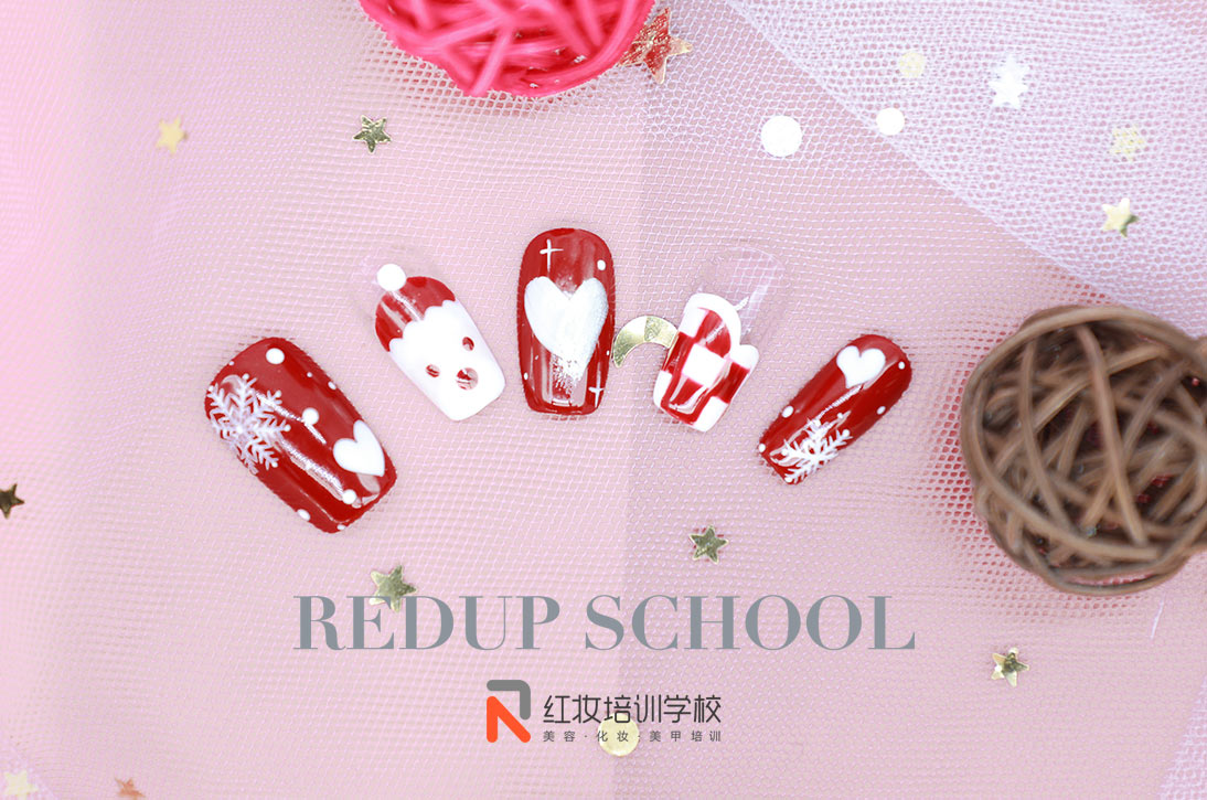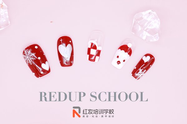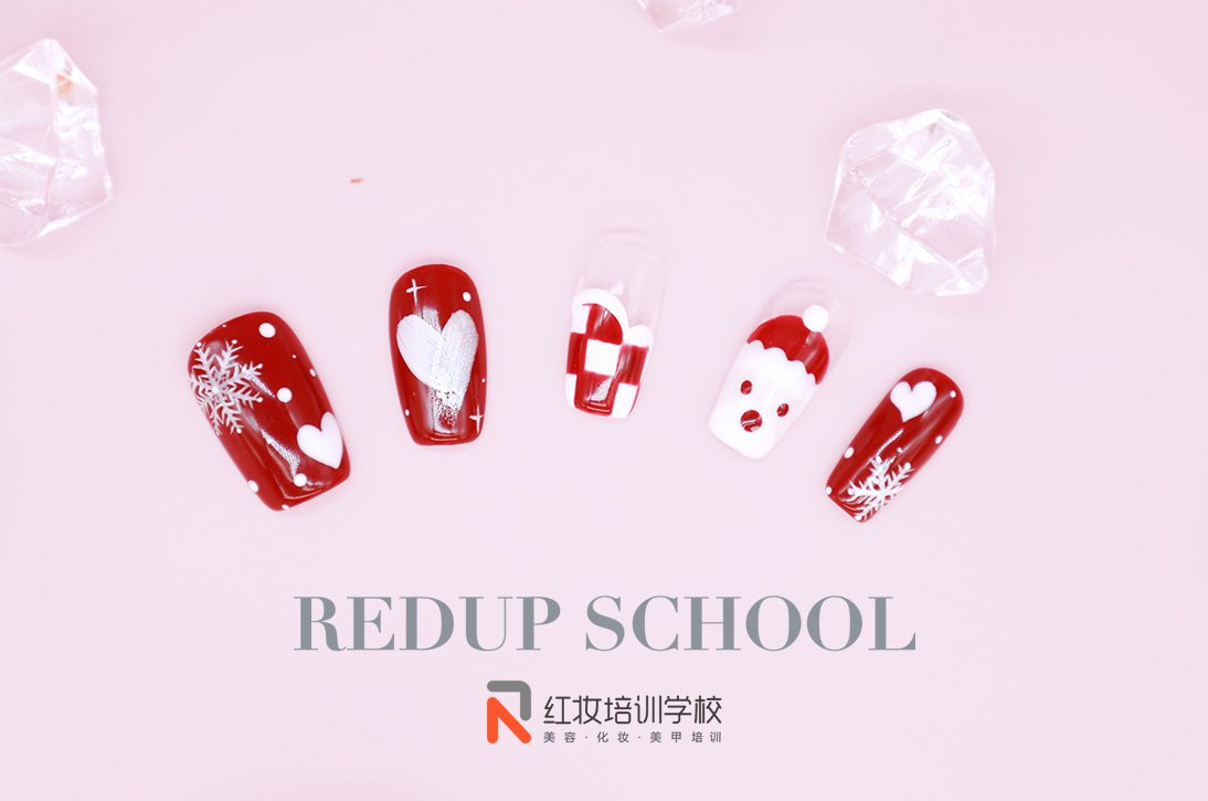 海口红妆学校酒红圣诞美甲,融入圣诞老人、雪花、爱心、红白相间元素,俏皮又可爱。整体的配色也比较喜庆,浓浓的圣诞节味道。